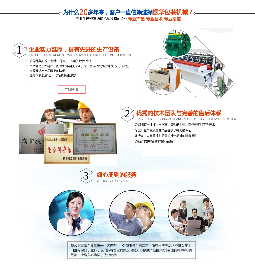蚌埠市振華包裝機(jī)械有限責(zé)任公司,是專(zhuān)業(yè)生產(chǎn)成套紙箱機(jī)械設(shè)備的企業(yè),公司位于安徽省蚌埠淮河之濱小蚌埠鎮(zhèn),已有二十多年的歷史與經(jīng)驗(yàn)。生產(chǎn)制造設(shè)備精良,配套檢測(cè)手段齊全,有一套專(zhuān)業(yè)素質(zhì)過(guò)硬的設(shè)計(jì)、制造、安裝調(diào)試與售后服務(wù)的隊(duì)伍,管理完善,可以為您提供全自動(dòng)高速單色、雙色、三色、四色、印刷開(kāi)槽機(jī)系列,中速新型結(jié)構(gòu)的印刷開(kāi)槽切角成型機(jī)系列及輪轉(zhuǎn)式開(kāi)槽切角成型機(jī)、釘箱機(jī)等30個(gè)品種、50余種規(guī)格的成套紙箱機(jī)械,產(chǎn)品吸納國(guó)內(nèi)外紙箱設(shè)備的長(zhǎng)處與優(yōu)點(diǎn),設(shè)計(jì)****、制造工藝精良 ...